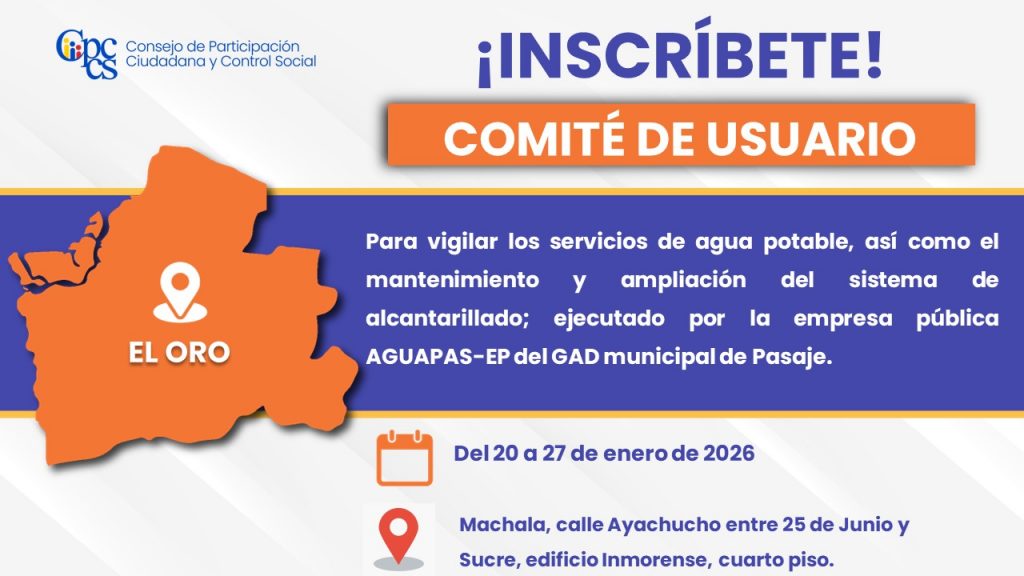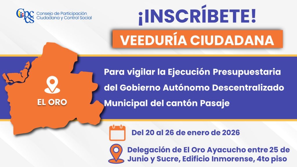 Quito, 20 de enero de 2026 Boletín de Prensa Nro. 1170 Veeduría Ciudadana para vigilar la Ejecución Presupuestaria del Gobierno Autónomo Descentralizado Municipal del cantón Pasaje El Consejo de Participación Ciudadana y Control Social (CPCCS) invita a la ciudadanía a inscribirse en la Veeduría Ciudadana para Vigilar la Ejecución Presupuestaria del Gobierno Autónomo Descentralizado Municipal […]