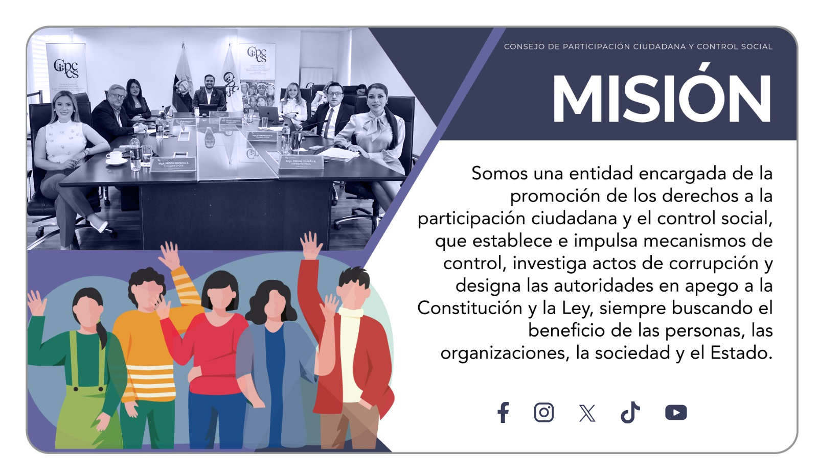 Somos una entidad encargada de la promoción de los derechos a la participación ciudadana y el control social, que establece e impulsa mecanismos de control, investiga actos de corrupción y designa las autoridades en apego a la Constitución y la Ley, siempre buscando el beneficio de las personas, las organizaciones, la sociedad y el Estado.